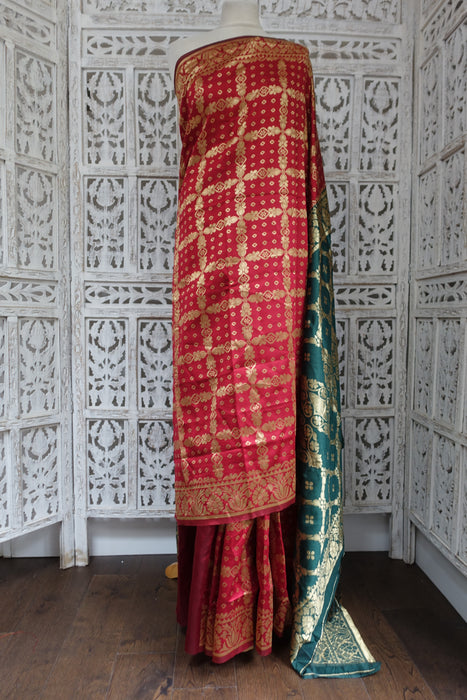 Red And Dark Green Silk Blend Sari With Blouse Piece - New