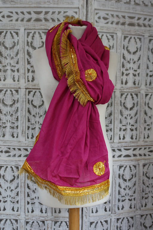 Dark mauve thin cotton with gold gota worked circles dotted all over, the outer edges are trimmed with a bright gold gota fringed braid. Size 2.35...