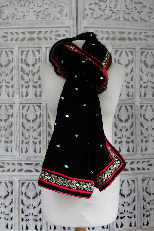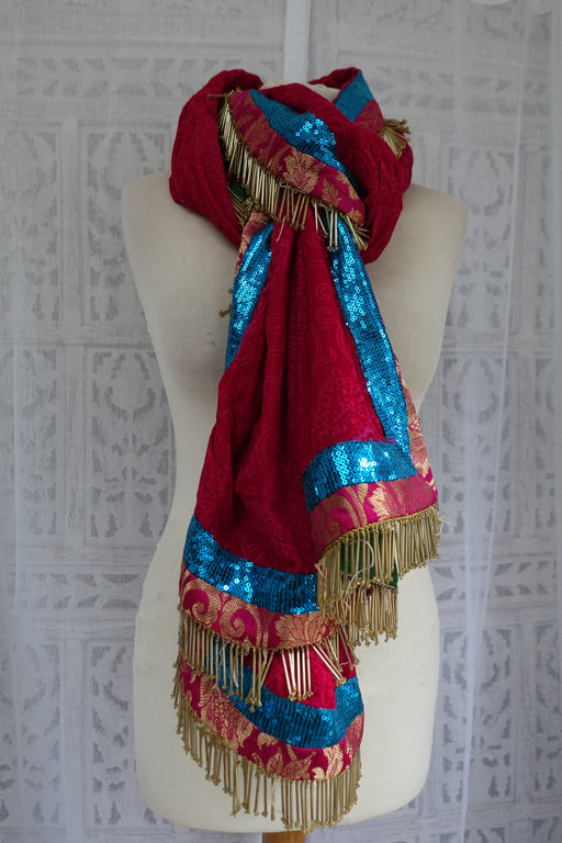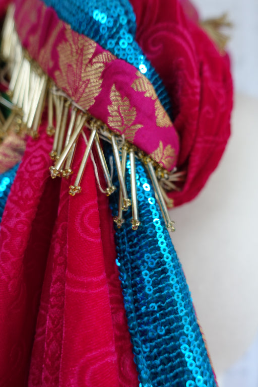 Embossed velvet dupatta with two contrasting trims, one is bright pink brocade, the other Is a peacock blue sequinned. Finished with long gold bea...