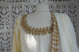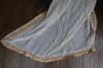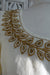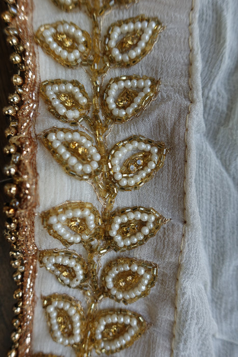 Dupatta is made of a lightly crushed chiffon and is finished with the same decorative beading around the outer edges , the reverse edhe has a wide gold braid trim.
