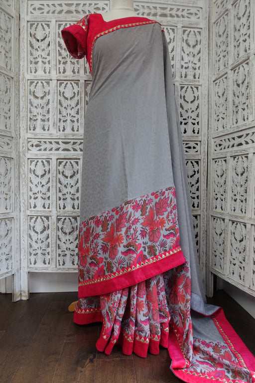 This is a 2 piece sari, the blouse is made of raw silk style fabric with printed chiffon detailing. It comes with a grey self-printed chiffon with ...