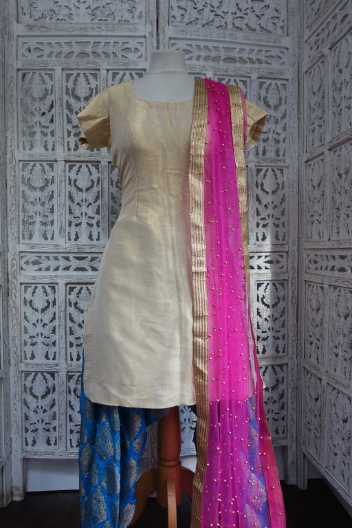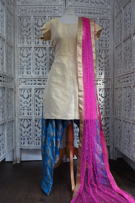 View full detailsGold Pink And Blue Banarsi Salwar Suit - UK 12/EU 38 - Preloved