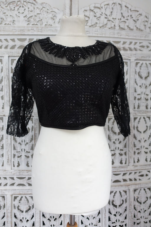 This is a mid-length sleeved choli blouse, it is made of embroidered and black sequinned fabric, the front has dark black and dare red stone work a...