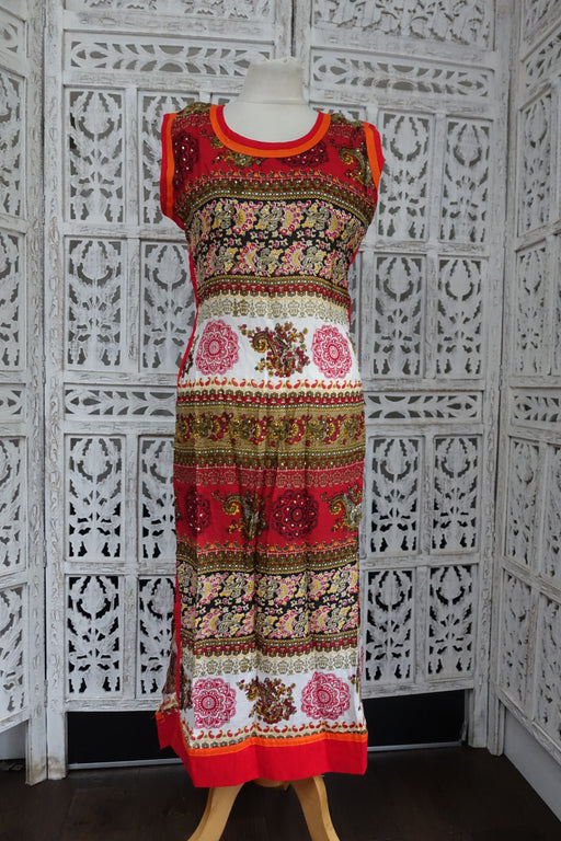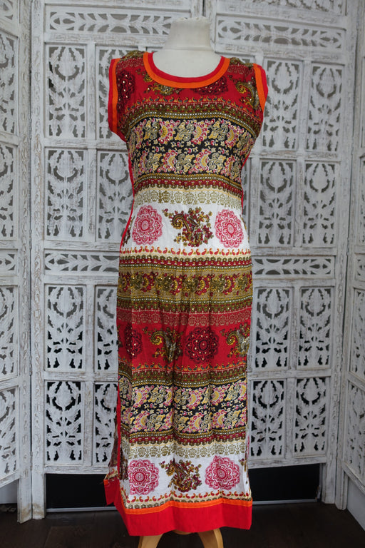 This is a long sleeveless tunic, it is unlined and made of a loose weave cotton viscose blend. It is vividly printed with the front design picked o...
