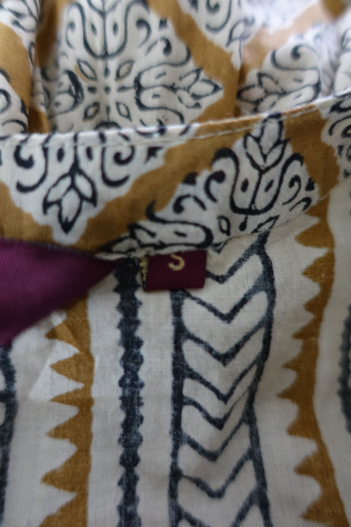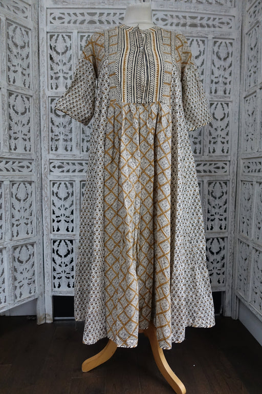 This is a loose fitting cotton print dress, in shades of cream, black and ochre. It has a couple of mother of pearl buttons to close and a small ma...
