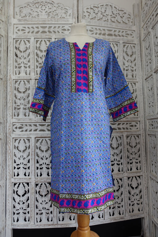 This is a cotton print tunic, the primary colour is blue. It has a contrasting trim around the neckline. It is unlined. Preloved in excellent c...