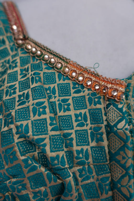 Kameez is made of a rich gold soft brocade, it is finished with latkans a a zip at the back. There is an ever so slight stretch of the fabric (see ...