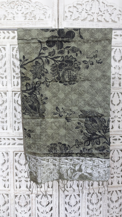 Olive Green And Silver Pure Silk Panels Hand Stitched Double Sided Scarf