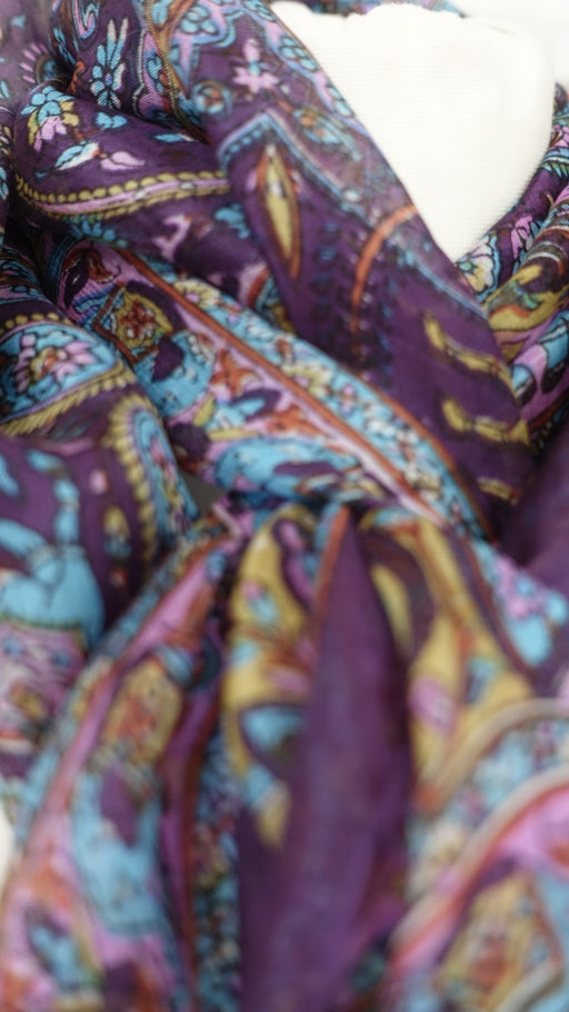 Wrap yourself in the luxurious richness of this beautiful pure silk scarf. Featuring a deep, captivating plum purple base, this scarf is adorned w...
