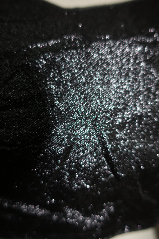 Black metallic sari blouse lined in cotton with latkans at the back. It has hook and eyes to secure as well as integrated bread pads. Measurements ...
