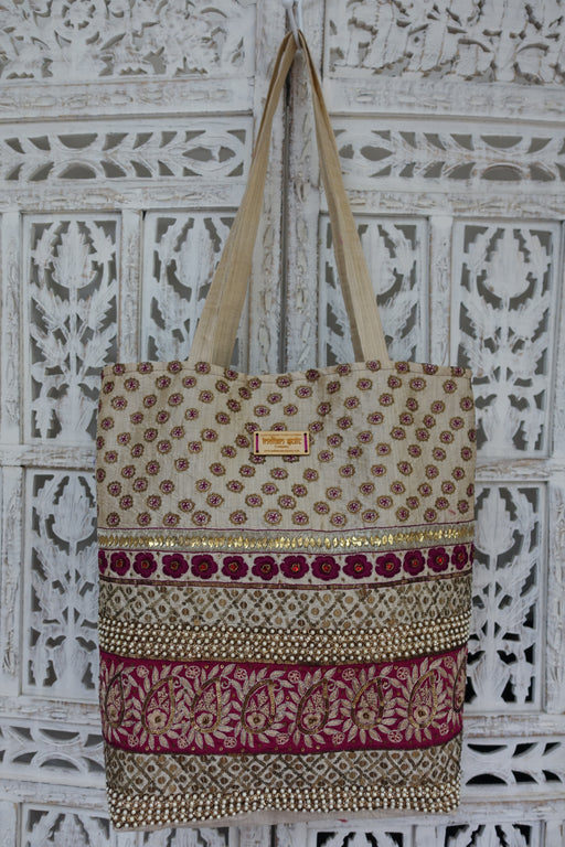 This is a printed cotton tote bag, one side has gold bead and zardosi work as well as mirror detailing. This is unlined. Outer fabric : cotton Inne...