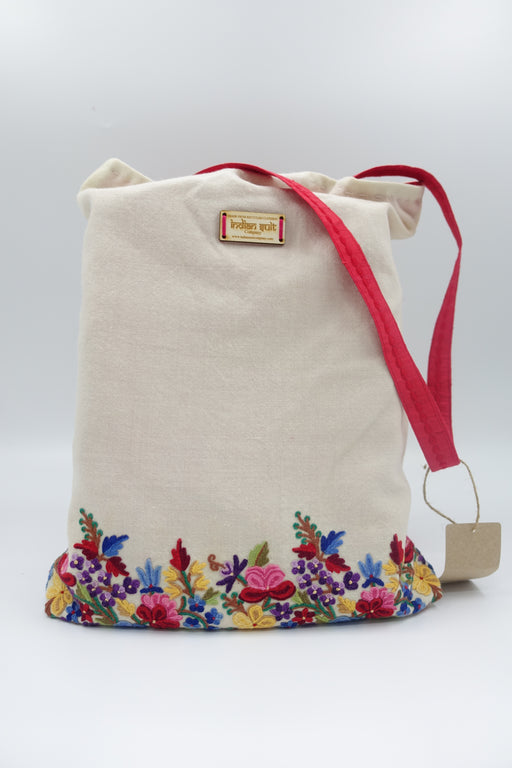 Cream Wool Floral Embroidered Bag With Red Silk Lining - New