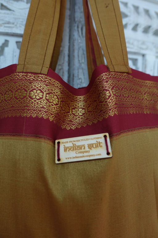 This is made of a soft silk blend and has a zari style border along the top. Material – silk blend unlined Lining – none Handles – 28cm Width – 28c...