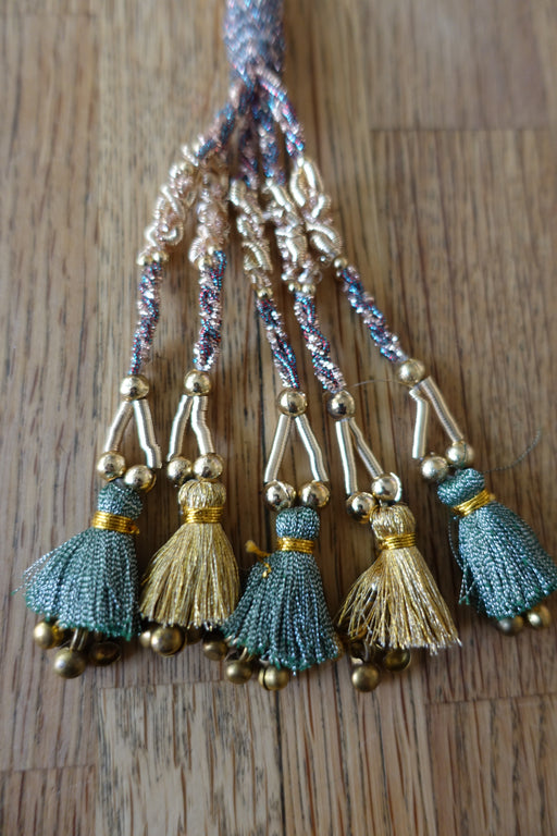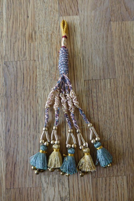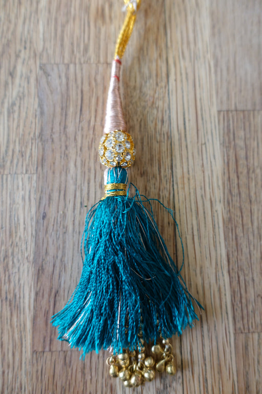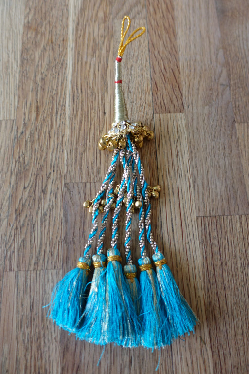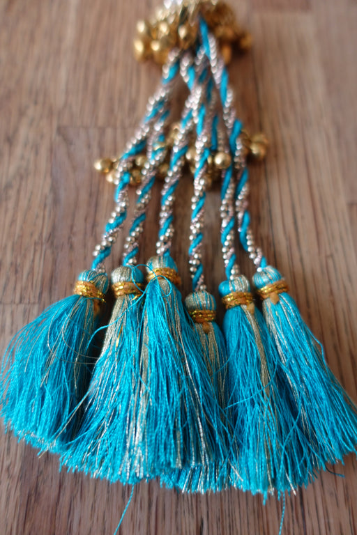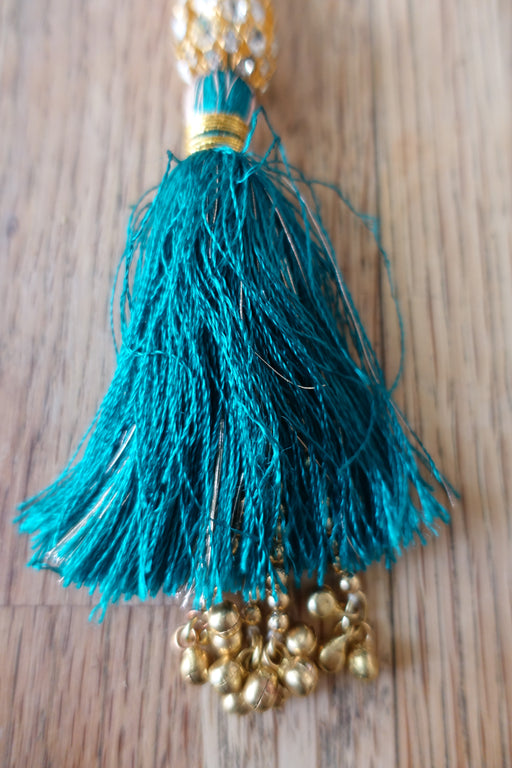 These are approximately 23cm long with peacock and gold silk thread tassels and gold bells.