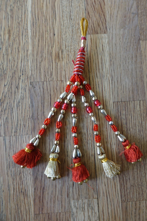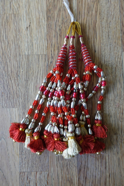 These are approximately 20cm long with rusty red and gold silk thread tassels and gold bells.