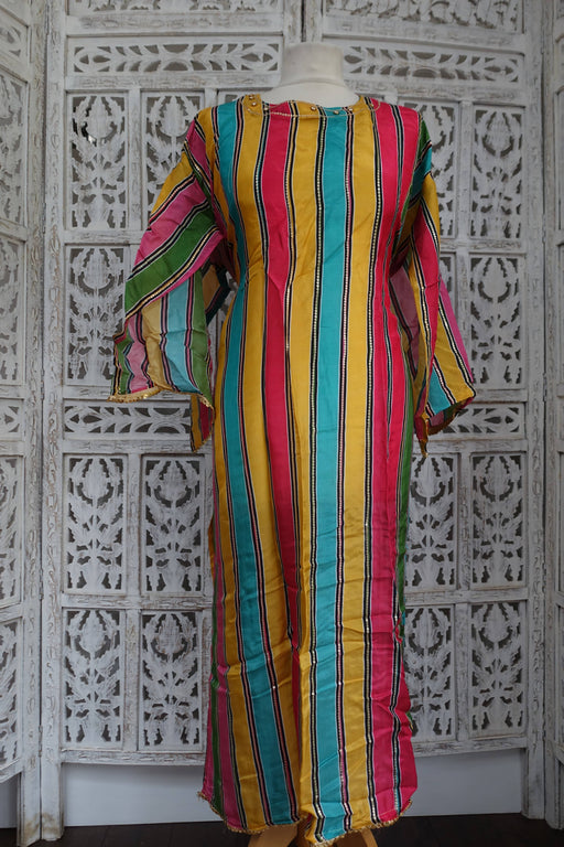 This is a long vintage tunic that can be converted to a fully opening if required. The front is a 2 tone tissue silk with a gold pattern woven thro...