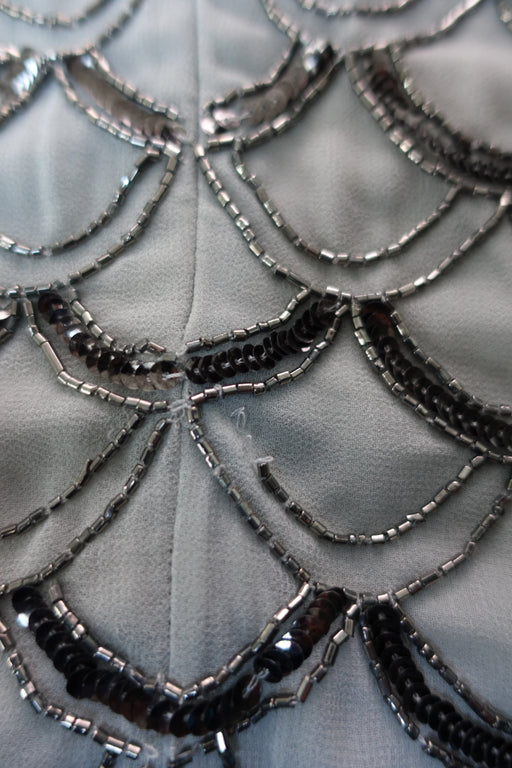 This is a dress by Monsoon, grey chiffon with scallop effect embellishment work made up of grey and anthracite silver beads and sequins.  Both back...