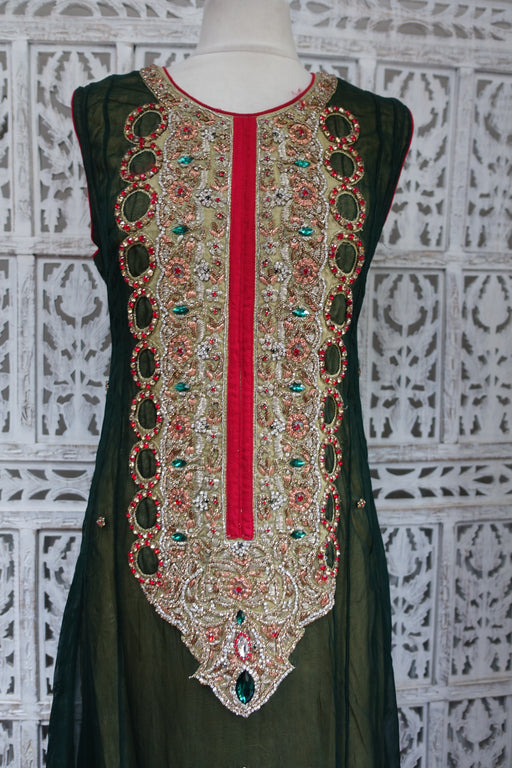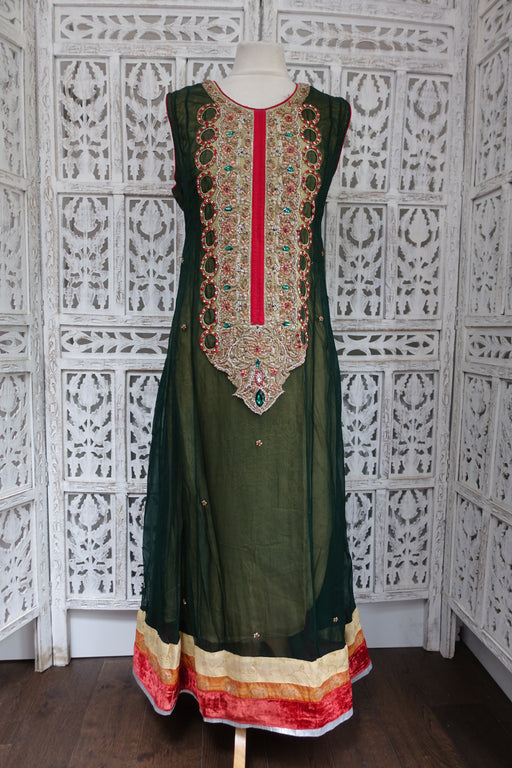 This is green chiffon dress, it is a bit longer at the back than the front.  It has lots of heavy embellishment work on the front, this includes di...