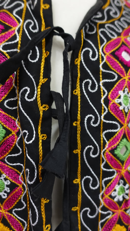 This is a black woven cotton silk sleeveless long jacket, it is embellished with a variety of beads, gold tilla, bronze beads . It is cotton lined ...