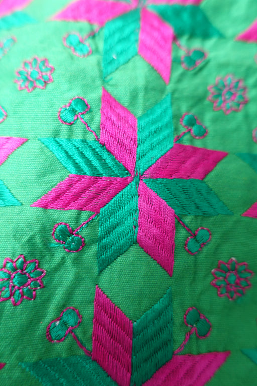 Description This is a breathtaking pure silk raw silk jacket embroidered in contrasting shades of pink silk thread and finished with coloured zardo...