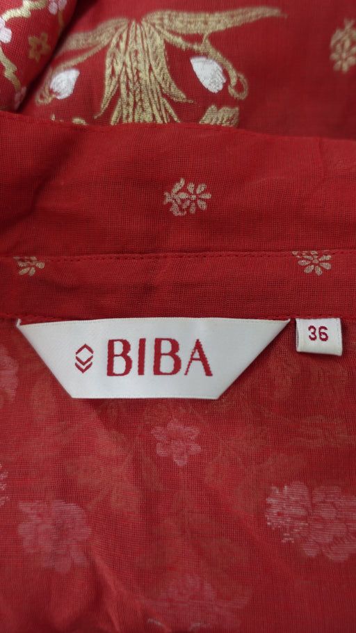 This is a stylish, coral-coloured silk blend jacket from the brand BIBA, in a size 36. It features an eye-catching pattern with gold and white flor...