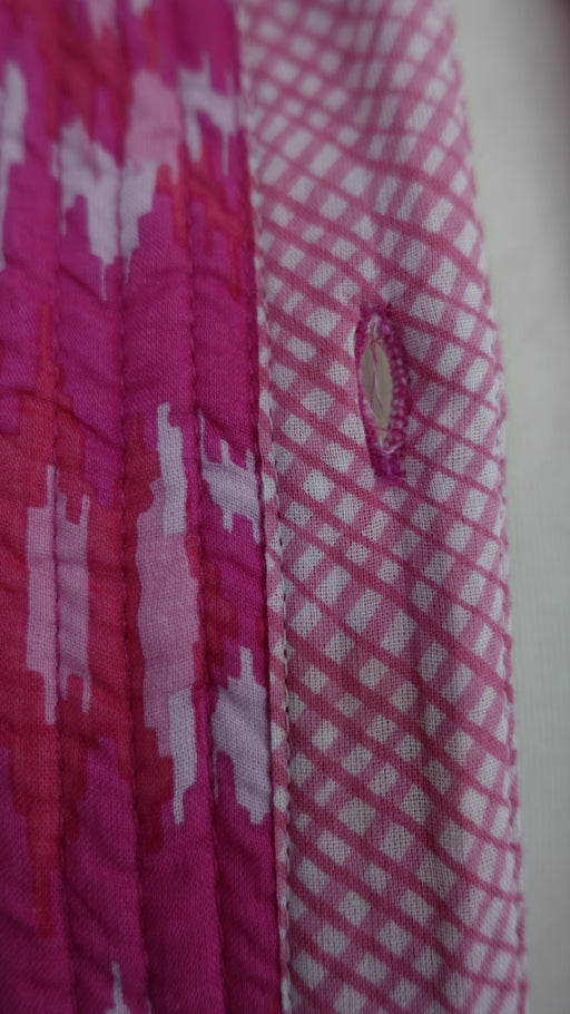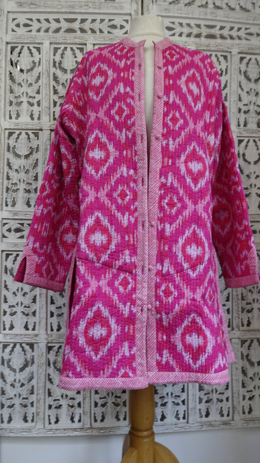 This is a beautiful slightly “A” line quilted jacket made of cotton, it has an ikat print on the outside with two side pockets, a small collar and ...