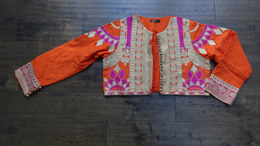 This is a fabulous bright orange and pink jacket made of art silk, it has hook and lip fastening as well as lots of embellishment work. It is by A...