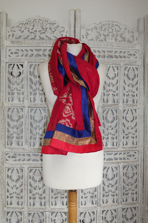 This is a lovely pure silk scarf, the main part is a rich teal colour, the outer parts are red with small metallic buta woven through the fabric an...