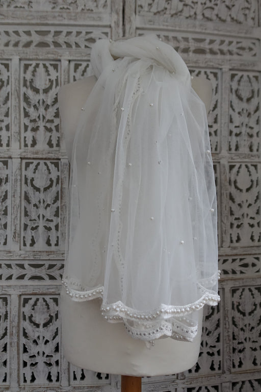This is a fine white net dupatta finished with a crocheted lace and gold braid trim. This is new in very good condition. Measurements - 109 x 2...