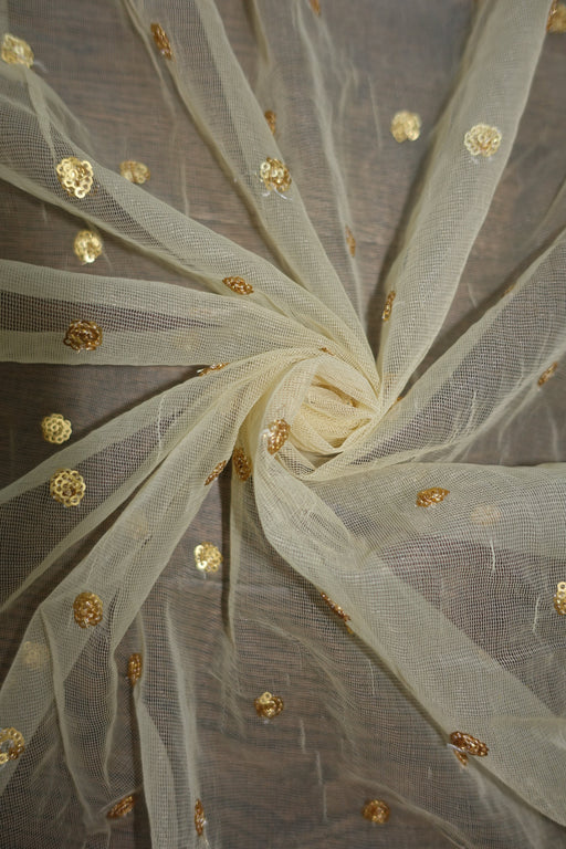 Fine net with small hot dots placed uniformly. The edges have a 3" wide matt gold braid trim as well as small bead, zardosi and kundan work detail...