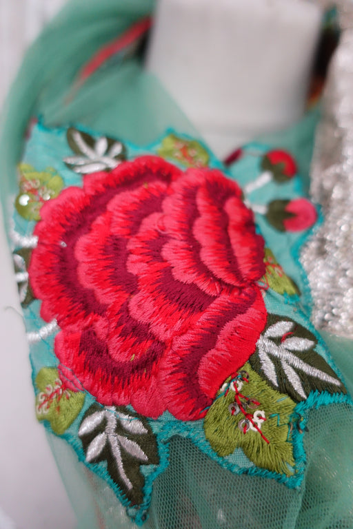 This is a sage green fine net dupatta, it features a vivid embroidered floral design and has contrasting fabric and metallic braid work trims. Mea...