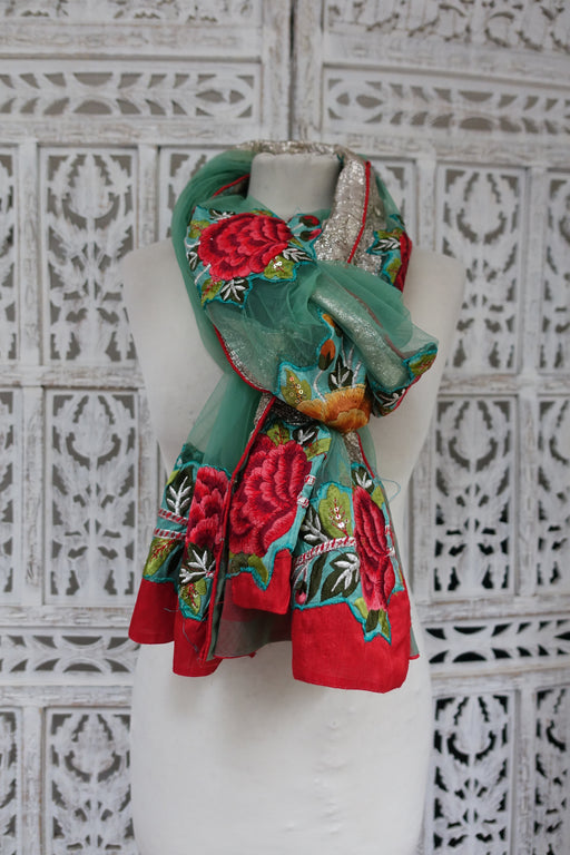 This is made of a soft net and is beautifully embellished in a mix of khaki silk thread work, iridescent beads, sequins and teardrop shaped red bea...