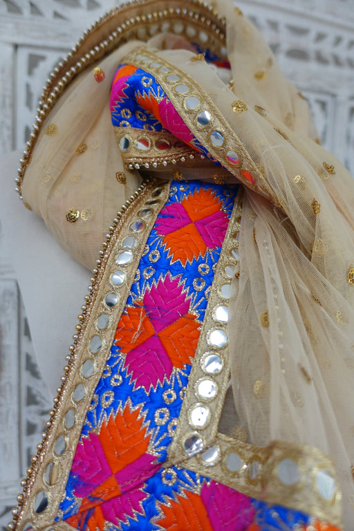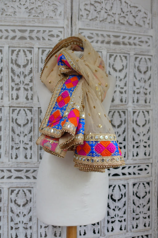 This is made of a fine net, it is embellished with lots of little sequins and has a bright orange, pink and blue phulkari embellished edges with fa...