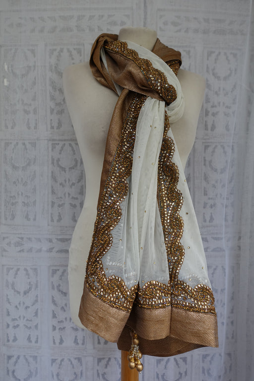 Description – this is a fine net dupatta, it has large silver sequins encased in metallic bronze thread work the reverse edges has a wide crushed o...