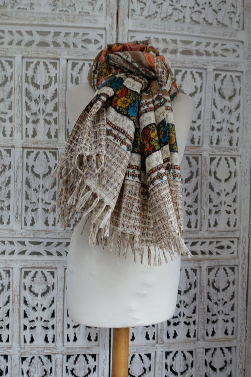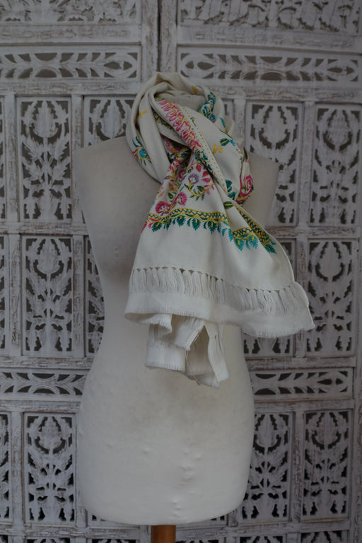 Cream Wool Shawl With Pastel Embroidery - Preloved