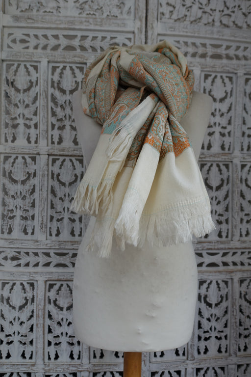 Description – 100% pure wool cream with pastel peaches and aqua. Fabric – 100% pure wool Measurements -  108 x 214cm Condition – new