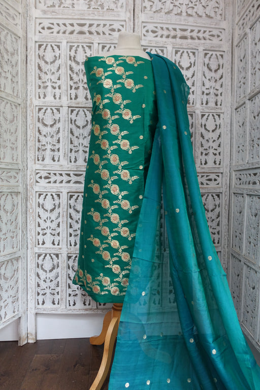 Description –  this is a vintage pure silk unstitched suit complete with a pure silk chiffon dupatta. Both the silk and dupatta are embellished wit...