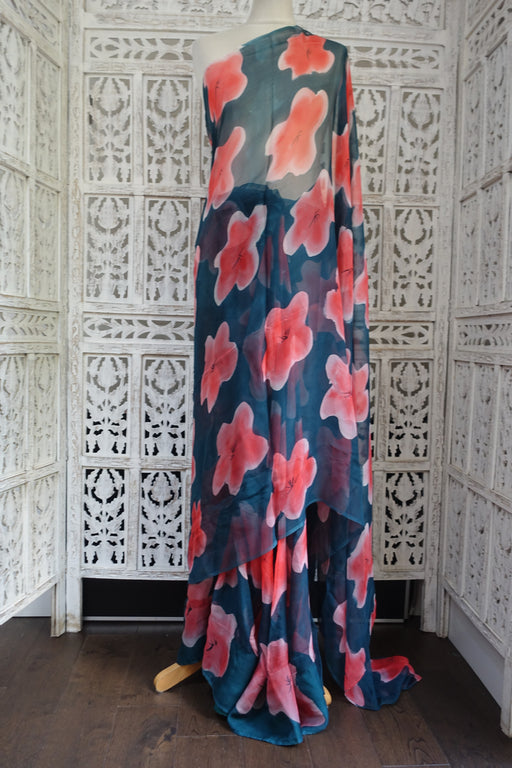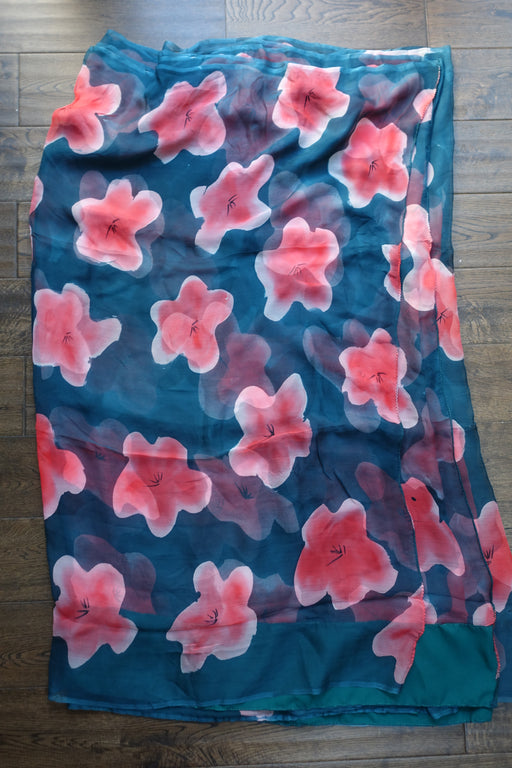 This is a fine printed silk chiffon, t has a denim blue background  with a large corally pink flower design.  This is brand new in excellent condit...