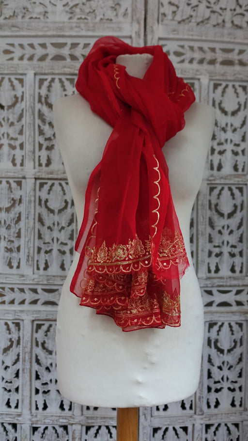This is vintage red chiffon dupatta, it is embroidered with delicate metallic gold thread work.   This is a vintage piece around 30 years old, it i...