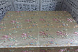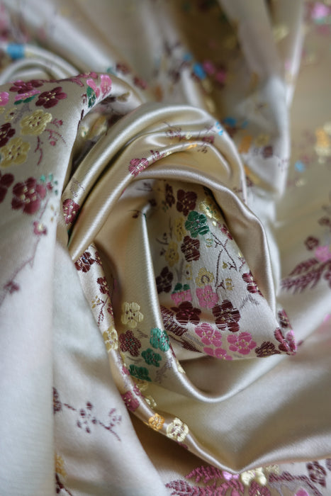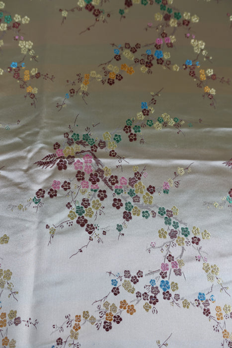 This a beautiful creamy gold woven satin tablecloth, it has a small floral design in vibrant colours.