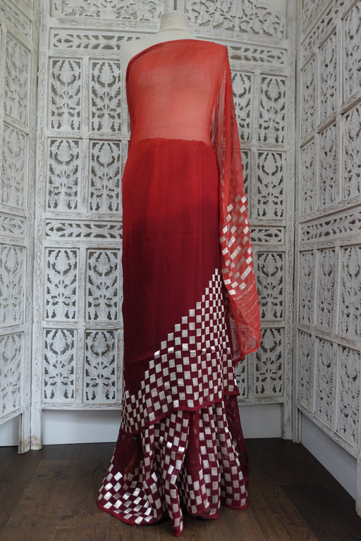 Rust And Orange Silk Chiffon Silver Sari - Preloved