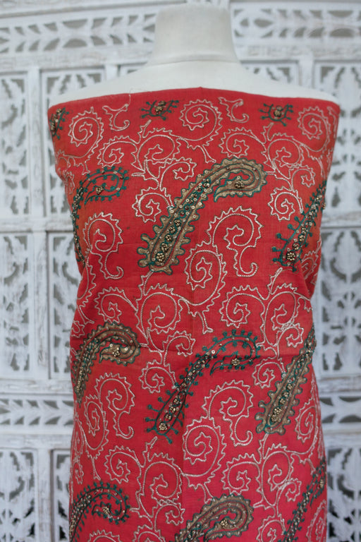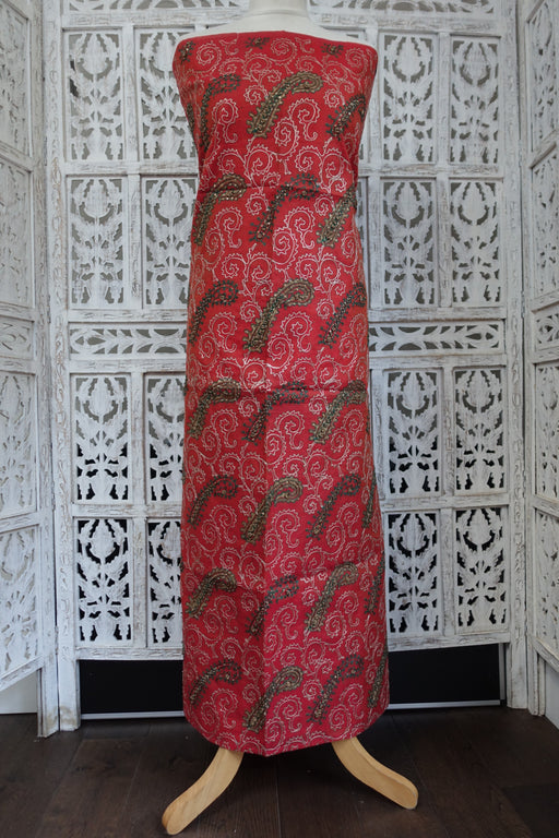 This is a rusty coloured thin cotton blend, one side is gold block printed and the other side block printed too but embellished with matt gold bead...