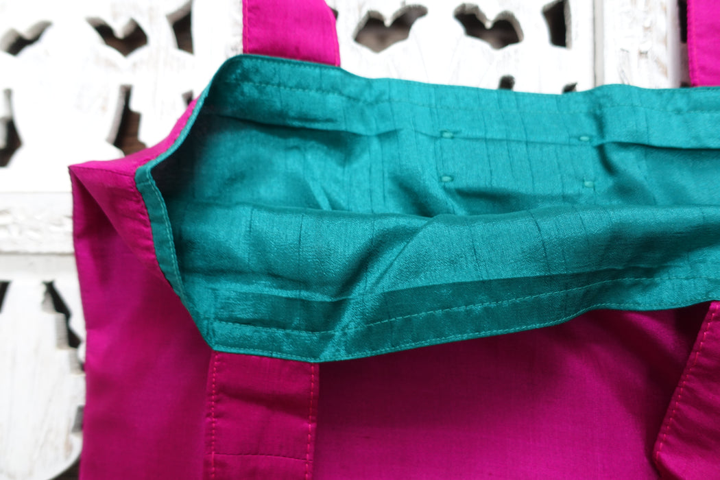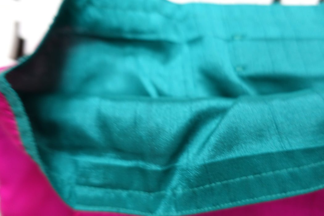 It is fully lined in a contrasting jade coloured faux raw silk.
