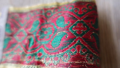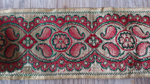 This is an unused vintage roll of banarsi braid trim, it features a floral pattern in a green and gold zari thread work.