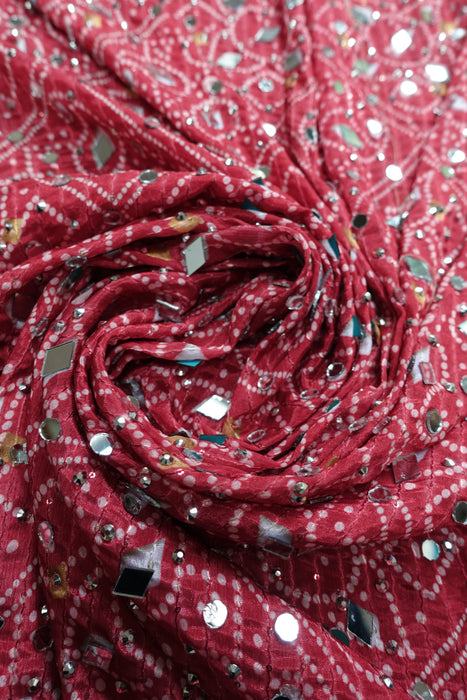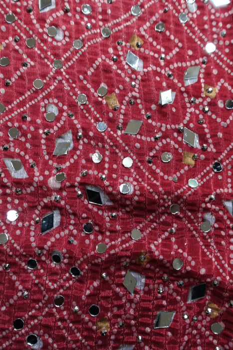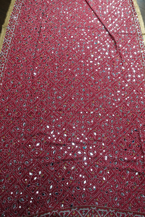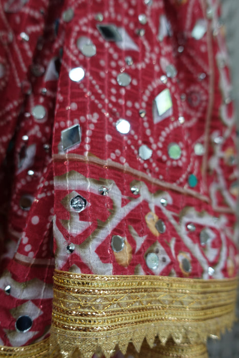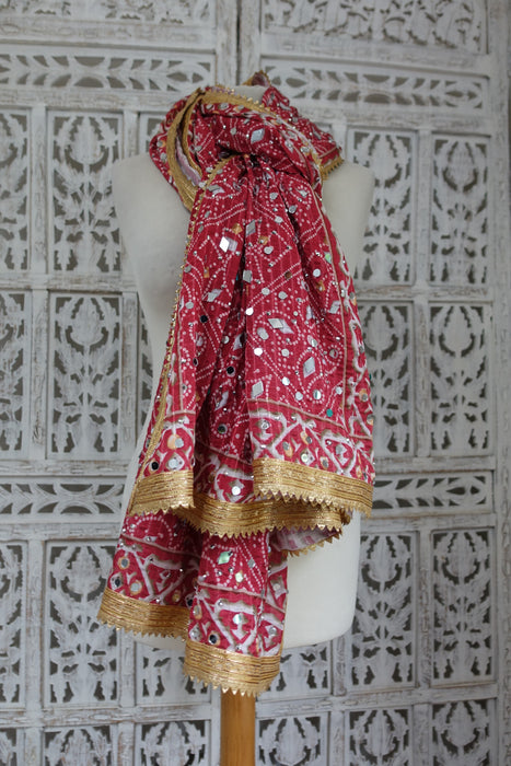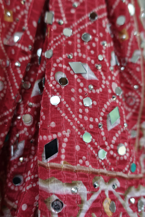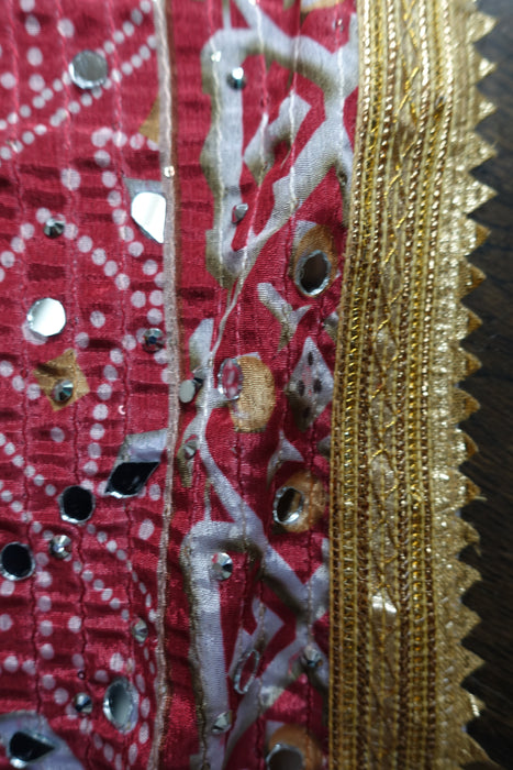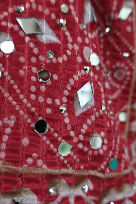 Description – This is a printed crepe large dupatta, the outer edges are finished with a gold zig zag braid. The remainder of it is covered in small mirrors both round and diamante in shape ( please note there are sharp edges as these are not wrapped so care must be taken when wearing this).