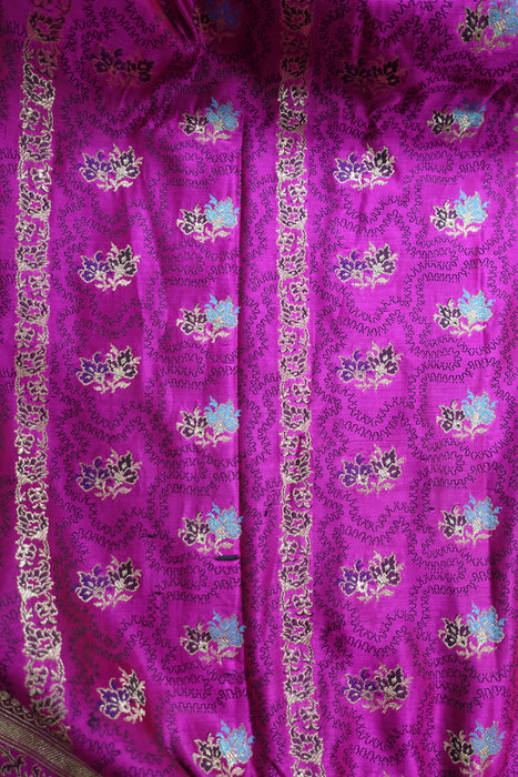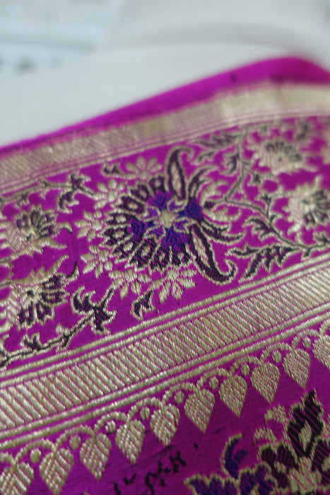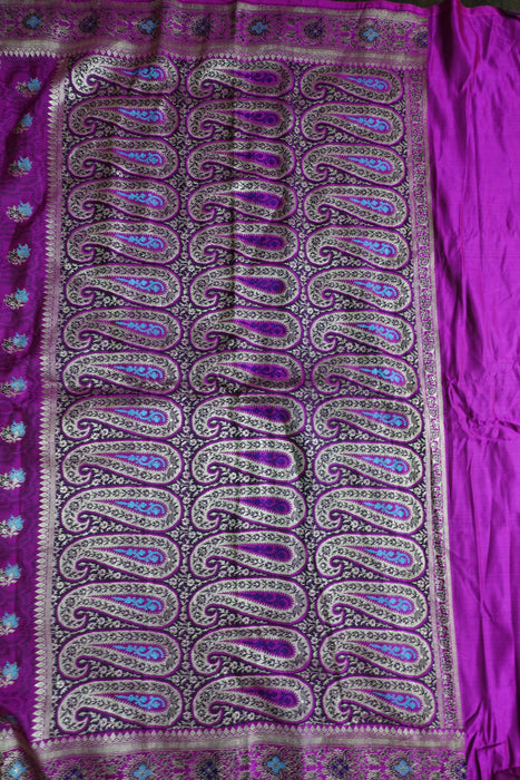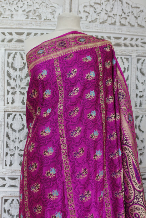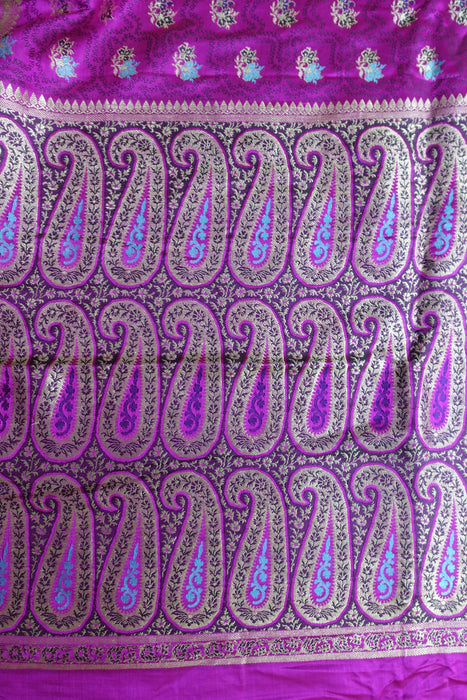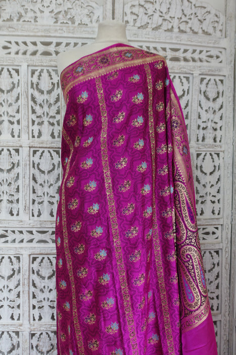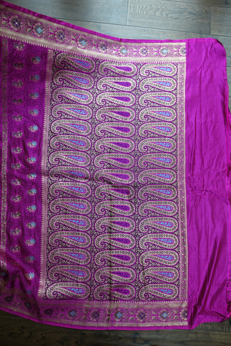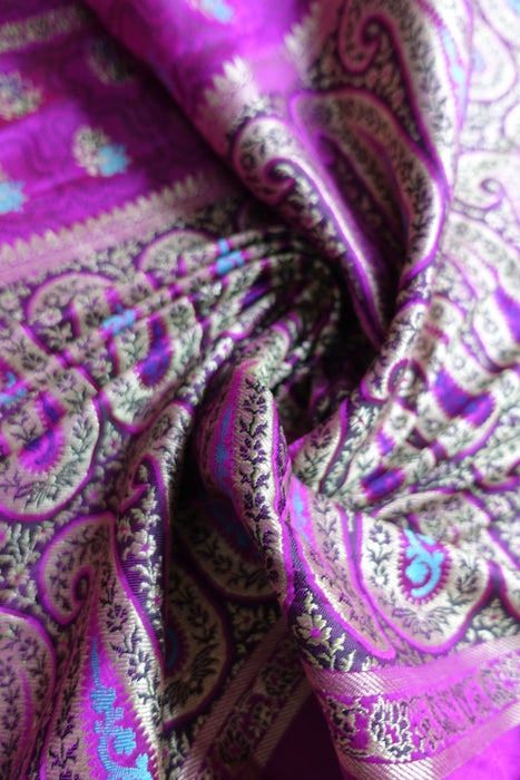 This is a rich sateen brocade silk vintage sari, it has rich gold banarsi zari thread work woven through it. The palla is more ornate with large paisley detailing.