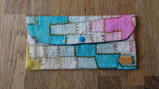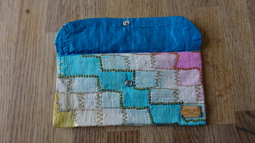 Colour : pastels with blue inner Fabric : raw silk Measurements : 10 x 20cm Description : cream vintage raw silk with blue plain silk