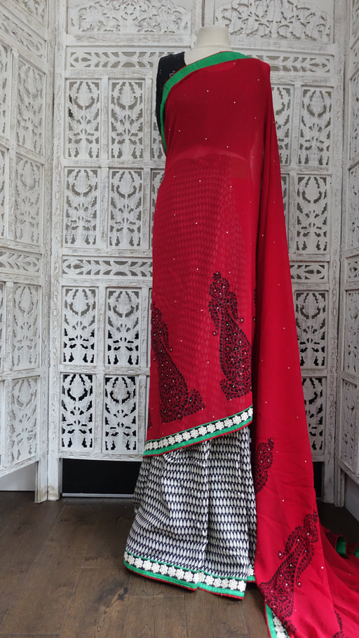 The sari is made up of a variety of fabrics including fine chiffon, raw silk and cotton silk. Some of the fabrics printed and trimmed with sparklin...