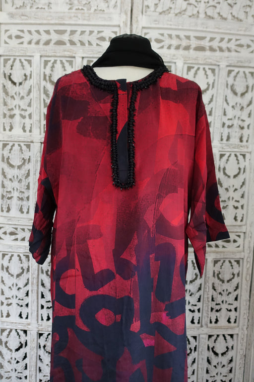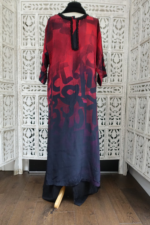 Kameez is a black and red, it is a really loose silk tunic lined in soft cotton made by Satya Paul. It has a decorated neckline with black silk bal...