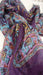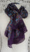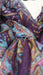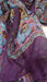 Featuring a deep, captivating plum purple base, this scarf is adorned with an intricate, multi-layered print that includes elegant border designs and detailed central motifs. The pattern is highlighted with vibrant jewel tones, including turquoise blue, lavender, and hints of ochre and red, creating a truly opulent look.
